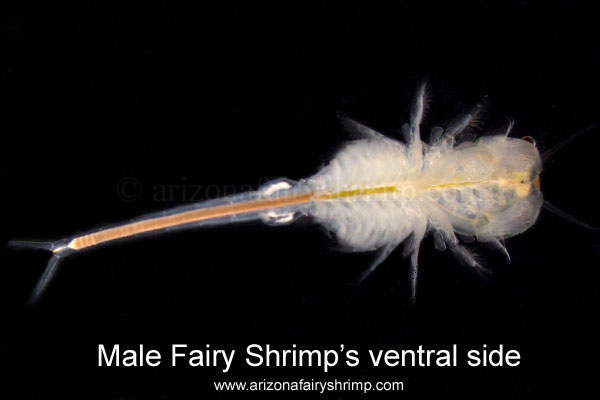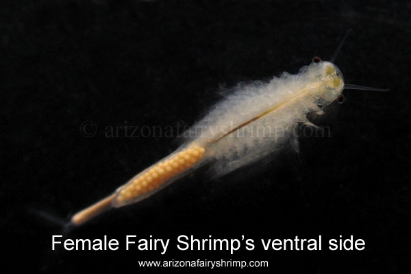 Mammoth Winter Fairy Shrimps is one of the Branchinecta family. They grow up to 30 mm and live for about 12 weeks. Male fairy shrimp is longer and fatter than female shrimp, and have large branch shaped antennas near the mouth, and uses those to grasp female shrimp less than 2 seconds in mating. Female shrimp has larger brood sack than other species when compare the ratio of the size of female shrimp and brood sack; it contains about 100 eggs. The color is white with brown or black body with the other colors as shown in the pictures above, and also there is blue and red colored by the environment. They hatch out and reproduce only during the winter season in the desert. Canadian winter storms bring down cold rain and snow to the desert, fill up dry pools with cold water. Then about 500 micrometer long shrimps hatch out, and grow up very slowly until the ice melt down and the weather becomes warmer. Then the baby shrimps grow up faster and start to reproduce in 2 weeks, but if the cold weather continues, then reproducing will be delayed for about 3 weeks. Very few of the new eggs hatch out when the weather becomes cold, and adult fairy shrimps survive in cold water even when the surface of water is frozen, and live together with the baby shrimps. Some of them hatch out during the deep monsoon season in the summer, but usually the water temperature goes up too high before they start reproducing. The eggs are developed as a pair of lines inside female shrimp's body to tail, and move into brood sack when it is still very small and white, and don't become bigger until fertilized. After mating, the eggs get bigger and the color will be changed to brown before being released. Female shrimps produce eggs every day of the first 3 days of reproducing, then once after 3 days and even slower day by day. Eggs are 160-190 micrometer in diameter. Usually the eggs need to be dried once to hatch like other fairy shrimps, but they have lower hatching rate of less than 50%. The eggs start to hatch out between 20 to 48 hours after submerged and keep coming out for 10 days. Shrimps can survive in wide range of temperature 40F to 72F degrees. The best water temperature of growth is between 60F to 68F degrees, but will stop growing at 10mm long. They grow larger if there is a big temperature change between the morning and the afternoon, up to 30mm.