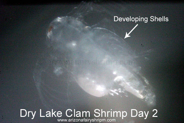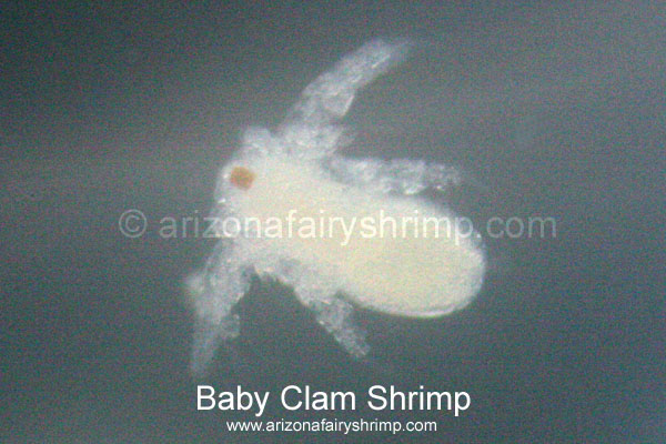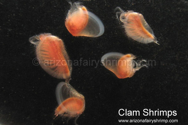 Dry Lake Clam Shrimp![]() ![]() Dry Lake Clam Shrimps are very active for a month after hatching, then they go down to the bottom of lake and stay laying on the mud or digging around. Most of them don't go up to the surface of the water unless the water is too warm or other bad conditions happen. Usually they are bright orange color, and become dark-red after a month, and it'll be hard to see through the shell because algae(bacteria) will grow on the outside of the shell. They grow up to 3/8 inch (10 mm) long, 1/4 inch (7 mm) wide, 1/5 inch (5 mm) deep (shell size), and live longer than 12 weeks in best condition. Only about a half of male clam shrimps find its mate in their lifetime. When a male clam shrimp finds a female, they bind together and only the male swims around in the water or they sink down to the bottom of the water. And they don't separate until one side dies or forced by some occasions, but all the female clam shrimps can produce eggs either having partner or not. Female clam shrimps develop the eggs in the body and when it become mature they keep the eggs inside the shell for a while before release. Sometimes eggs are kept inside the shell even when female clam shrimp dies before releasing, yet those eggs can hatch, too. Dry Lake Clam Shrimp's egg is very small (about 130~160 micrometer), and looks like a shiny yellow ball. Usually eggs hatch out in about 30 to 48 hours (sometimes in 16 hours) after exposed to the water, and baby clam shrimps are about 300 micrometer long when just hatched. The shell will be developed on the back (up side) on the next day, and becomes bigger to cover whole body of the clam shrimp in another two days. Clam shrimps are growing slower than any other crustaceans in the dry lakes of Arizona, but live longer.